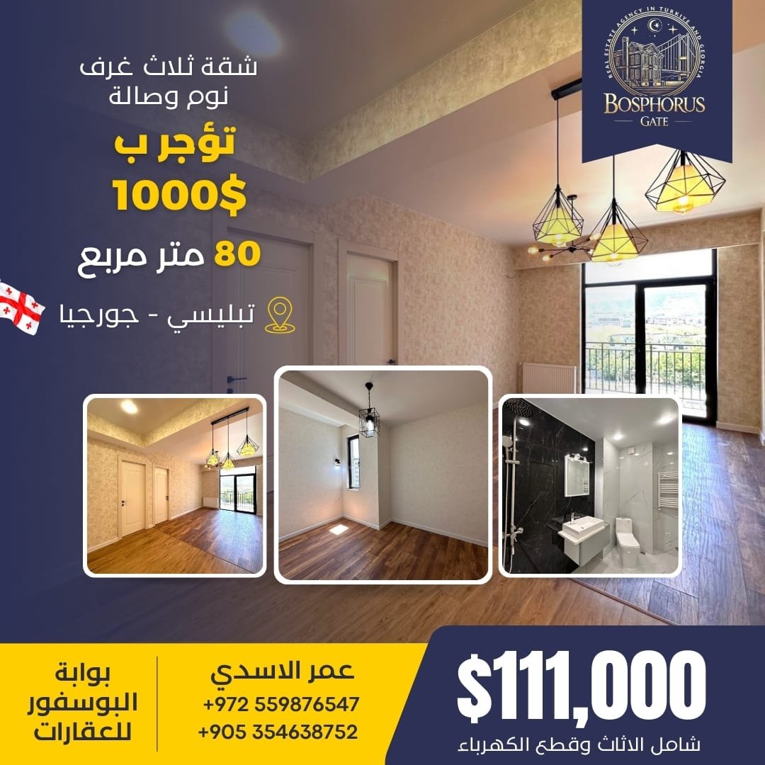 شقة ثلاث غرف نوم وصالة مساحة 80 متر مربع طابق خامس من عمارة 11 طابق سيتم تجهيزها بالكامل مع كل شيء مطبخ واثاث لكل الشقة. سيتم خصم 9 الاف دولار في حال استلامها وشرائها كما هي في الصور!! تبليسي – جورجيا – قريبة من الجامعات سعر الشقة 111 الف دولار شامل الاثاث وقطع الكهرباء تؤجر ب 1000$